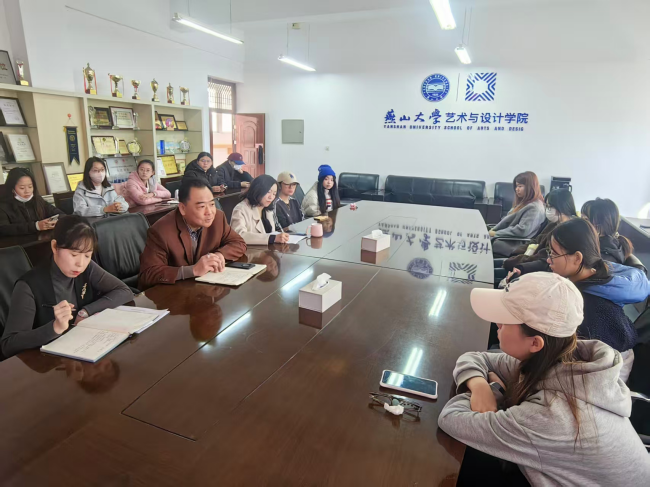 艺术设计学院艺术馆C305会议室内温馨启幕。学院党委张文超书记、副处级辅导员徐原老师、综合办公室宋立巍老师出席,辅导员卢文龙主持,23级本科音乐表演1班和2班同学参加。