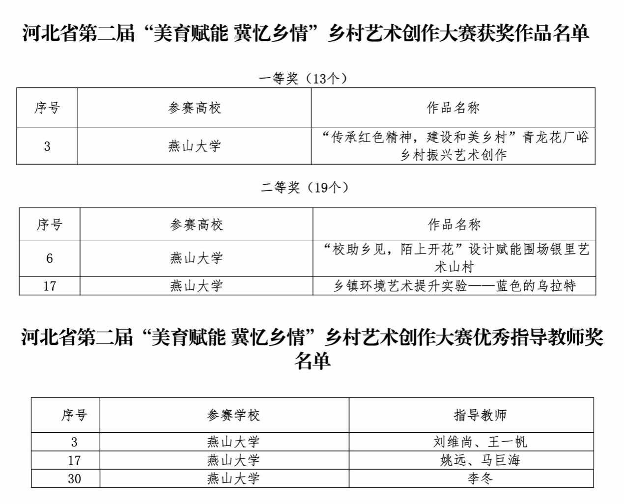 始终秉持“艺工融合、服务社会”的办学理念,鼓励师生将论文写在祖国大地上,把设计做在乡村田野间。本次大赛的佳绩,是学院长期以来坚持实践教学、服务地方发展的成果缩影。通过参与此类高水平赛事,不仅提升了学生的专业实践能力与社会责任感,也有效推动了高校优质美育资源向乡村流动,为河北省的乡村文化振兴与美丽乡村建设注入了鲜活的“燕大艺术力量”。
