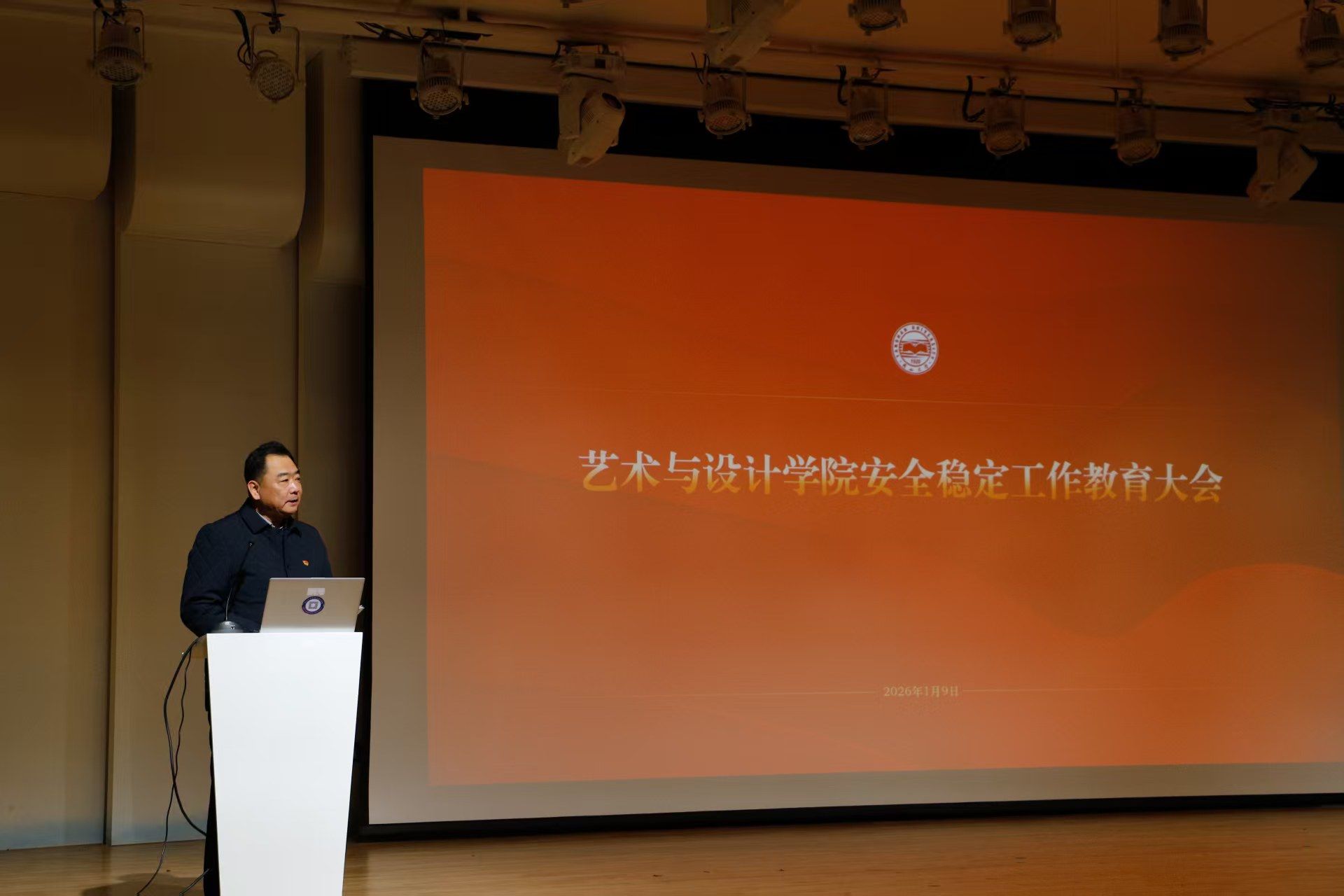 在音乐厅组织召开2026年安全稳定工作教育大会。学院领导班子成员及全体教职工参加了本次会议,学院工会主席徐原主持。