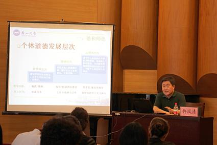讲座中,仵凤清教授从专业的角度阐述了师与德的内涵及其发展历程,引用大量的案例事实分析了当前高校师德状态存在的问题,表明高校要认真贯彻落实师德条例,营造舆论氛围,逐渐加大对高校师德教师的奖励。仵凤清教授结合他的教学经历,总结了教师应有的工作思路,并建议开展一些有关师德的具体工作和活动。