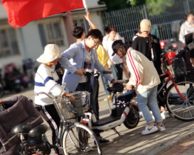 党支部成员在摆放电动车