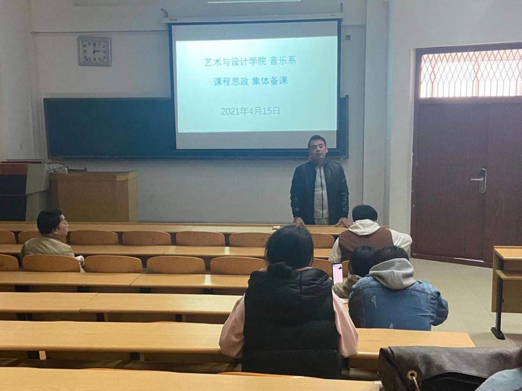 音乐系“课程思政”系列活动之一——集体备课于2021年4月15日在音乐馆B206举行,系主任董梁飞主持会议,音乐系全体器乐教师逐一发言,音乐系全体教师参会。