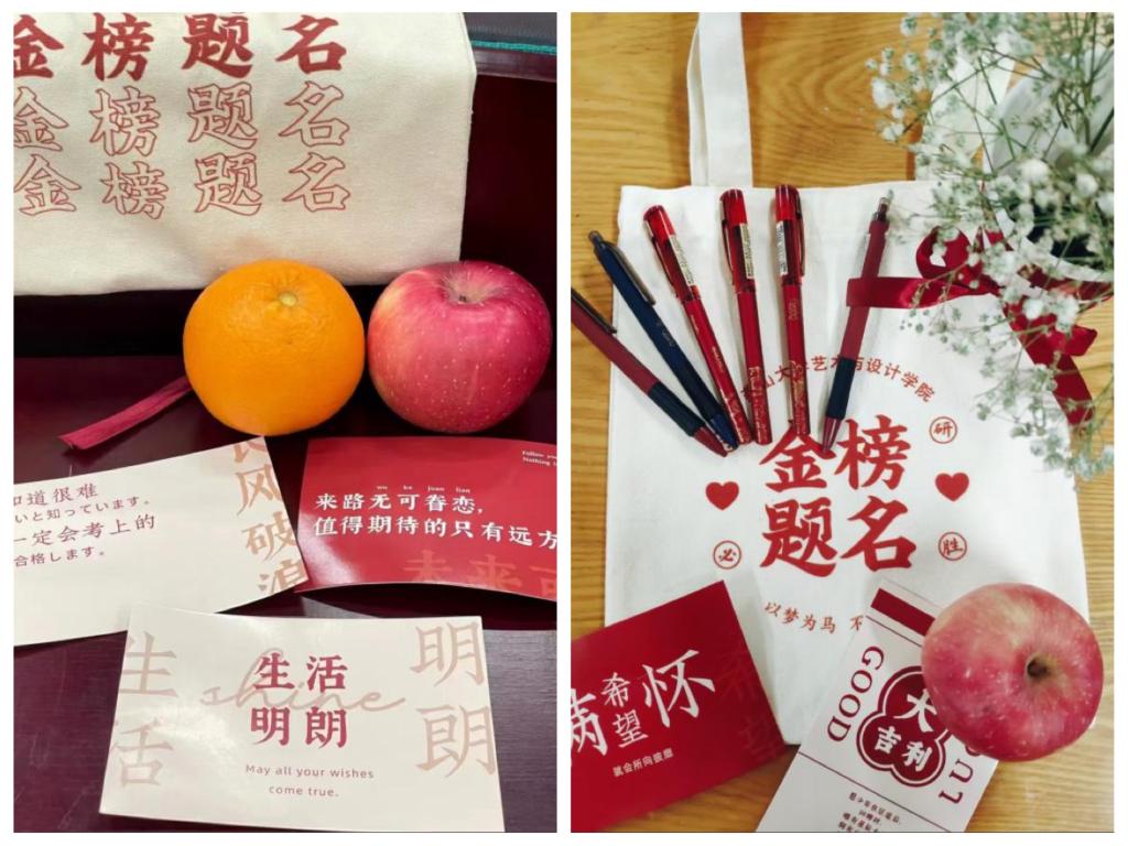 一个橙子,寓意心想事“橙”、一个苹果,祝福“苹”安上岸、三张精心准备的祝福贺卡和考试用到的涂卡笔和碳素笔、精心定制的“考研必胜”福袋,从颜色、图案到文字、样式,哔咔漫画