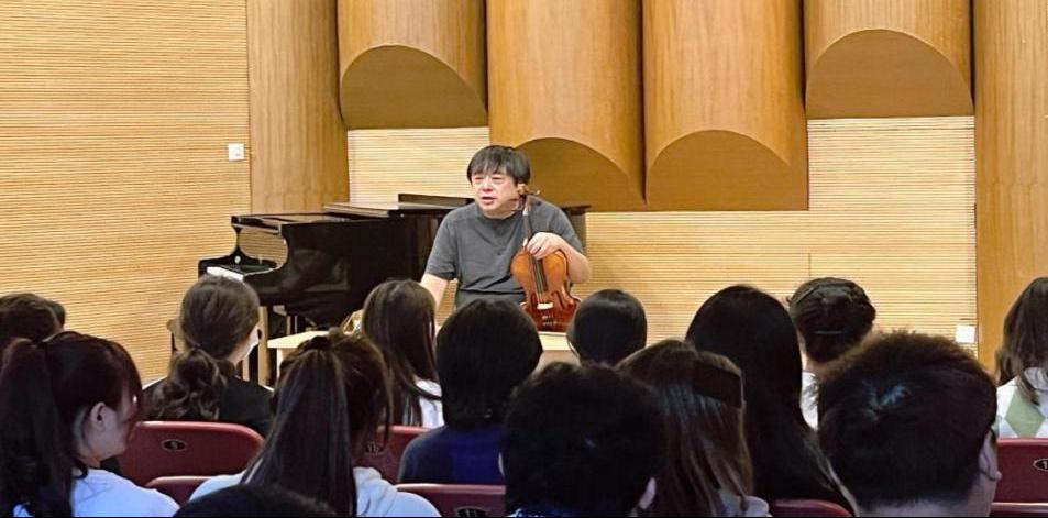 首先,岂老师详细介绍了交响乐团的形式、各种乐器的配置以及声部结构的原理。同学们与岂老师展开积极互动,了解交响乐团发展动态。随后岂老师讲解了莫扎特《G大调弦乐小夜曲》的音乐特征,从音准、节拍到运弓等方面结合演奏实践进行深入讲解。并与小提琴专业杨江东、邓至善同学,大提琴专业周君宇同学合作、进行了细致的示范演奏。岂老师精湛的演奏与精彩的讲座给同学们留下深刻印象。