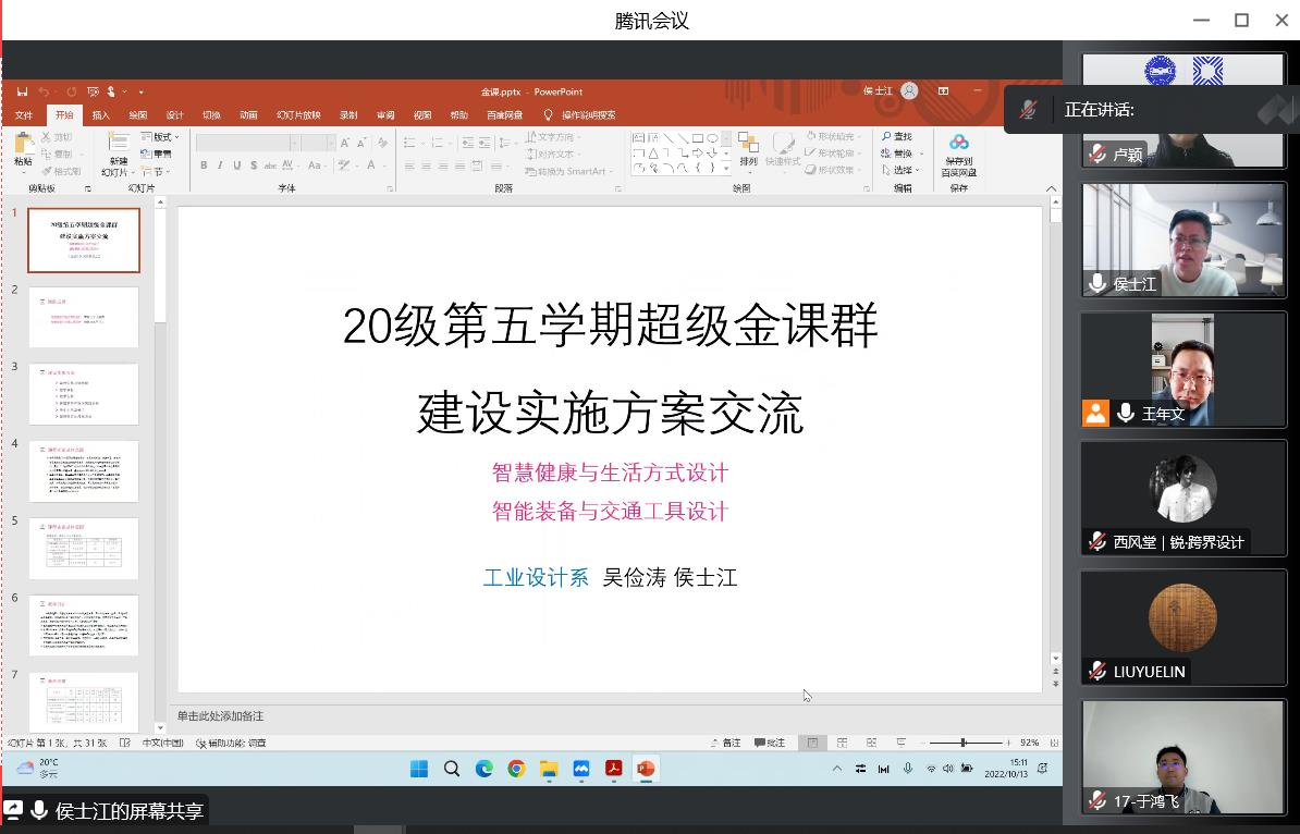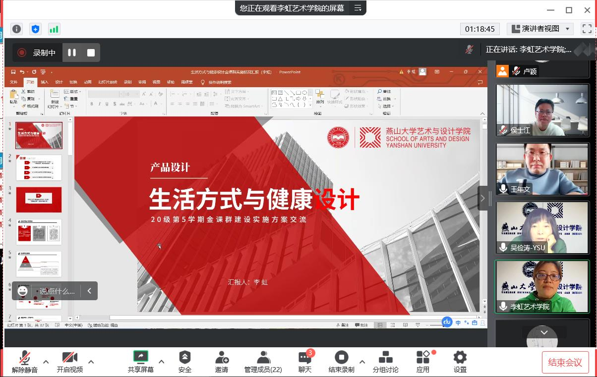 其次由工业设计金课群负责人侯士江教授、产品设计金课群负责人李虹副教授分别介绍20级第五学期超级金课群建设的探讨实施方案,分别从课程实施总体思路、教学目标、教学安排、课程项目和课内实践安排、学生小组及分工、课程项目的考核方式等六个层面详细的分享了教学理念和创新思路。
