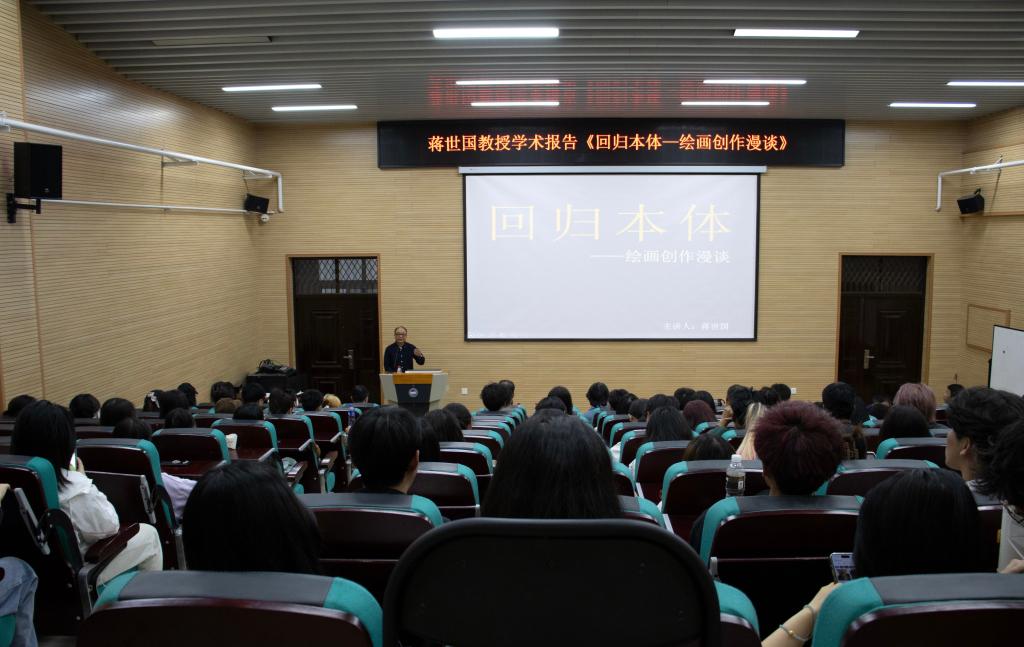 本次讲座以绘画创作的“回归本体”为主题,蒋世国教授结合自己多年的实践经验,分享了他对于艺术创作本质的深刻思考和独特见解,通过古今中外不同类别与形态的经典绘画作品的总结,对绘画的功能、意义及创作原理进行深入分析与阐述。此外,蒋世国教授对中国红色经典绘画的研究颇具心得,讲座过程中他紧紧围绕专业思政进行讲解,使得这次学术报告更具有现实意义与价值。