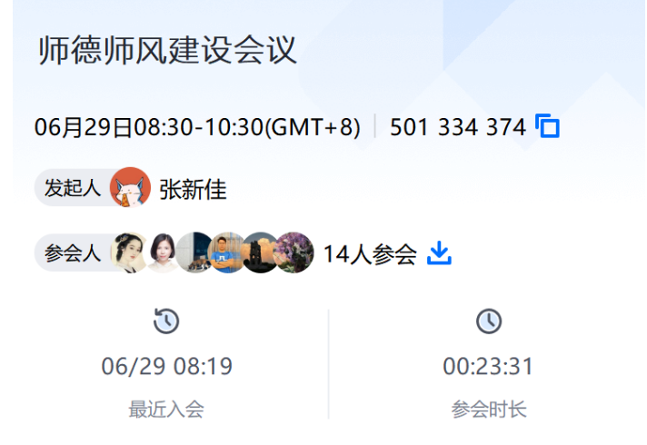 2023年6月29日8:30,环境设计系组织全体教师以线上腾讯会议的形式召开师德师风集中学习教育会议,会议由系主任温瑀主持。