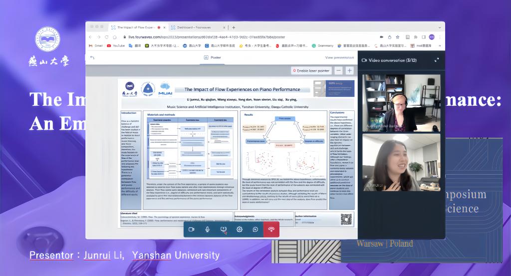 近日,2023年表演科学国际研讨会议于8月17至20日在波兰华沙成功举办。该会议由波兰医科大学/肖邦音乐大学主办,英国皇家音乐学院(RCM)/帝国理工学院表演科学中心协办。我校与同济大学、上海音乐学院等7所中国高校参加。我校22级音乐与舞蹈学硕士研究生李俊蕊同学(指导教师:许英)进行会议发言,并与Zoé Karlikow(法国索邦大学)、Audrey-Kristel Barbeau(加拿大蒙特利尔魁北克大学)等专家教授围绕通过“心流体验影响钢琴绩效的实证研究”,探索音乐学与心理学、工程学等学科交叉的前沿问题,扎实推进音乐与科学的融合机制研究进行深入交流。