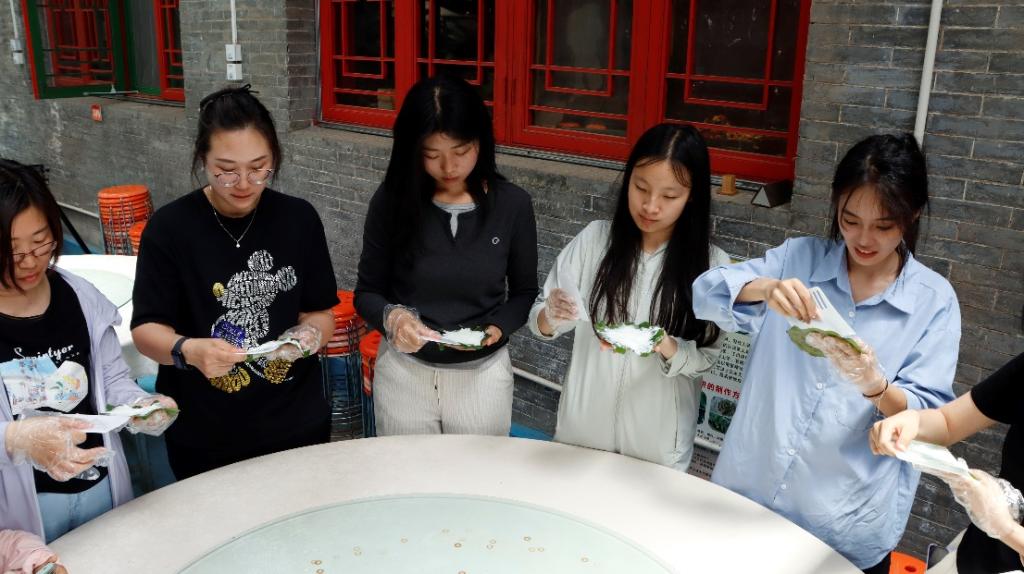 中午,板厂峪长城公园邓东兰老师对长城非遗美食桲椤叶饼制作进行讲解,桲椤叶饼又叫“戚家饺子”“戚家饼”,相传明代抗倭名将戚继光奉命镇守山海关时,军中有很多南方的义乌兵,非常思念家乡的粽子,有个聪明的火头军就地取材,用长城外生长的清香硕大的桲椤树叶做皮,里面用面粉包了点菜馅,经过蒸制清香扑鼻,并且非常好吃,解决了戍边将士一大生活难题,也缓解了他们的思乡之苦。随后师生们共同体验制作了桲椤叶饼,李京美(이경미)老师更是对长城非遗桲椤叶饼制作赞叹不已,详细了解了非遗美食背后的故事,感受明代将士的戍边生活。