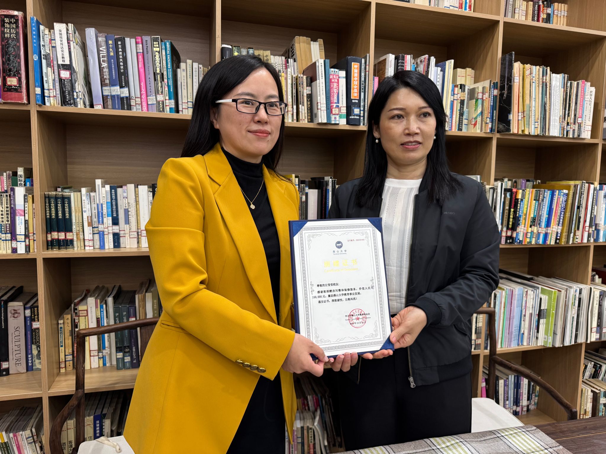校友办副主任纪红月与左莹莹会长展示捐赠证书