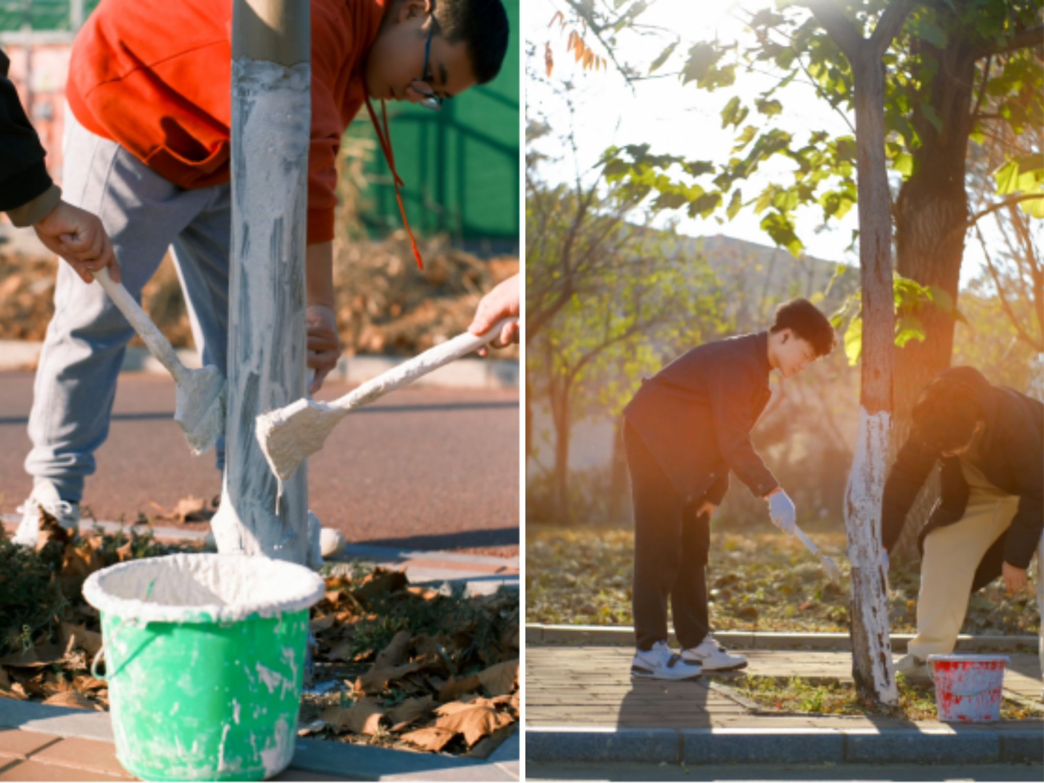 当日下午,同学们从新图书馆后沿着西区两侧的道路,顺地势而下,在熟悉而美丽的校园里,修枝、粉刷、剪护,精心养护每一棵树木。晚秋的阳光洒在校园,映照着同学们专注的面庞,劳动的身影成为校园里一道亮丽的风景线。