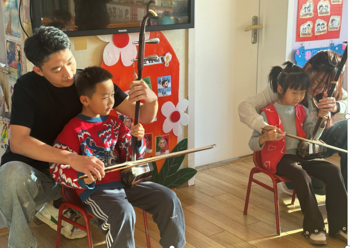 在展示和互动过程中,学生们辅导小朋友,让他们近距离的感受中华传统文化、民族乐器,使他们能够感受到音乐动带来的乐趣。教小朋友们仔细观察指法、耐心纠正细微的错误,帮助他们建立起对民族乐器的初步认识。同时,在互动中注重倾听孩子们的感受与疑问,用简单易懂的语言解答他们的困惑,激发他们的学习兴趣和动力。