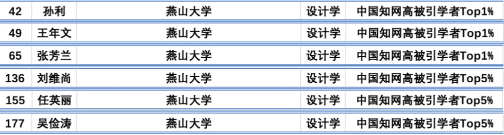 近日,中国知网下属的中国科学文献计量评价研究中心(简称“知网评价中心”)公布了“2024中国知网高被引学者”名单,我院孙利教授、王年文教授、张芳兰教授入选设计学学科中国知网高被引学者Top1%,刘维尚教授、吴俭涛教授、任英丽副教授入选设计学学科中国知网高被引学者Top5%。