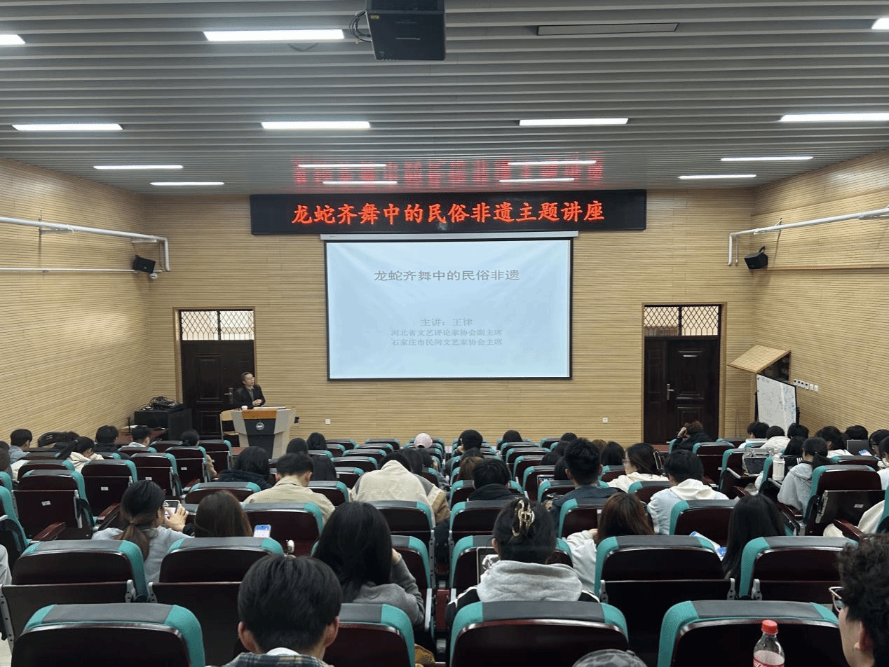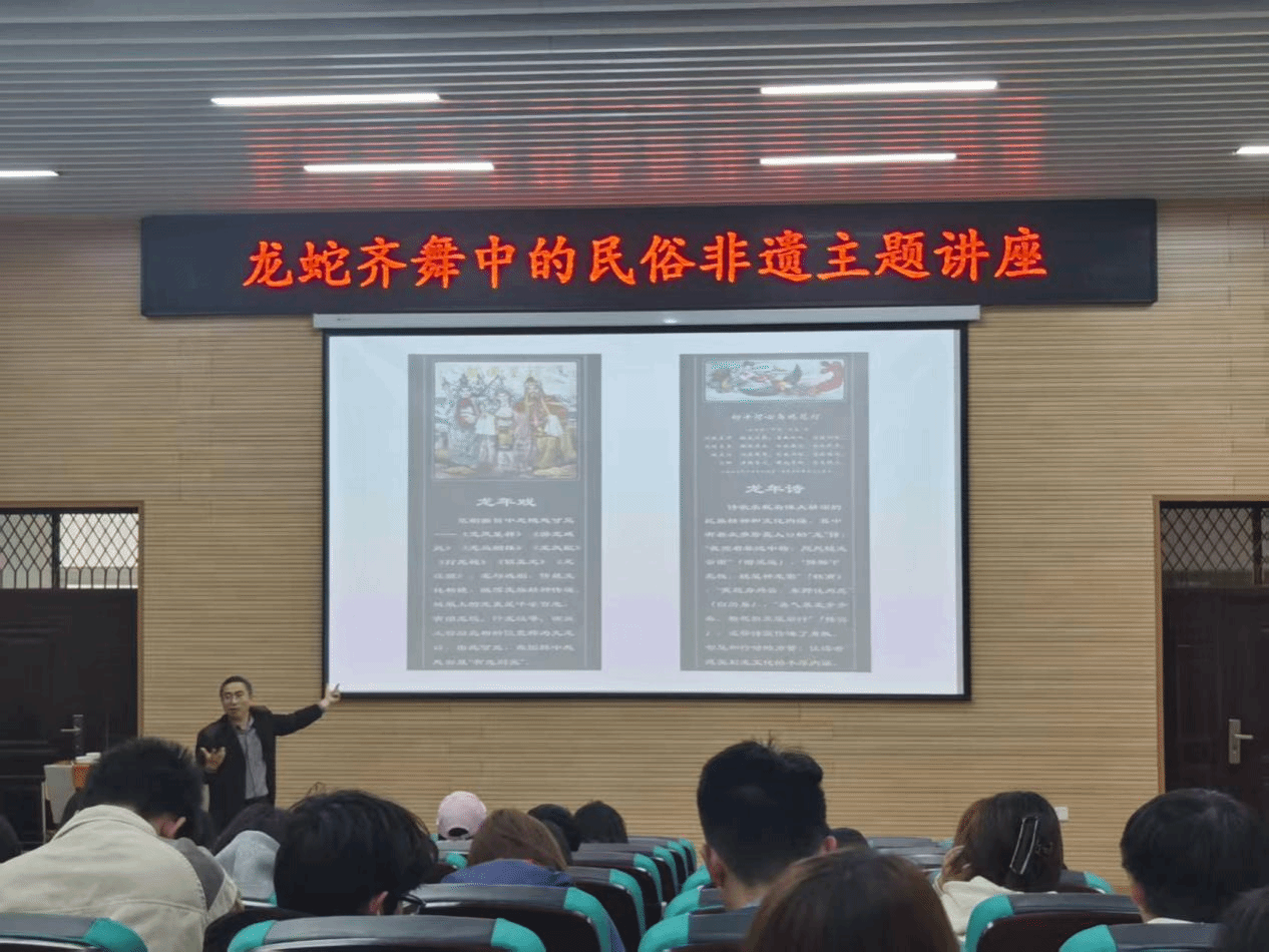 王律老师长期致力于地域文化、红色文化、民俗文化的研究与传播。在讲座中,他凭借深厚的学术功底和丰富的实践经验,从多个维度深入剖析了民俗非遗文化的魅力与价值。王律老师以“龙蛇文化”为切入点,讲述了龙与蛇在中华文化中的独特地位和象征意义,深入解读了龙蛇文化在民俗活动、传统艺术中的体现,阐释了它们所蕴含的中华民族精神内涵。同时,结合蛇年的特殊背景,分享了蛇年相关的民俗传统和非遗技艺,带领师生们领略了传统文化的深厚底蕴和独特魅力。