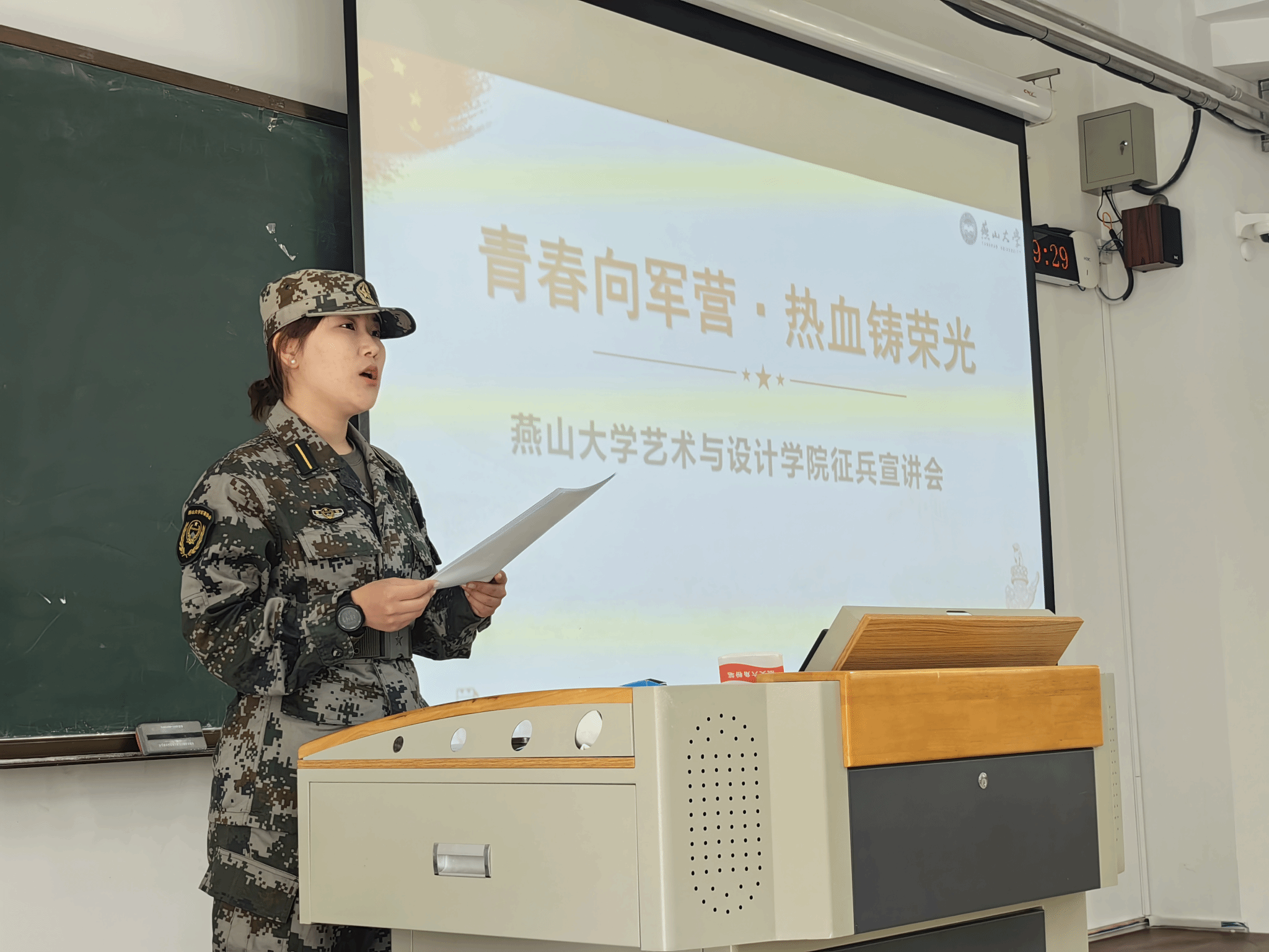 本次宣讲会邀请任佳蕊、韩斌、雷如香三位参军入伍复员返校的优秀大学生担任主讲人。他们结合自身军旅经历,生动讲述了军营生活的磨砺与成长。曾服役于火箭军某部的任佳蕊以“迷彩青春,不负韶华”为题,分享了“军营教会我责任与担当,更让我懂得青春的价值在于奉献”从学生到军人的蜕变历程。联勤保障部队退役大学生韩斌通过视频展示了保家卫国的震撼场景,激励同学们“用热血守护山河,用行动诠释信仰”。武警复员学生雷如香则以“坚守为国为民的使命”为切入点,讲述了在部队锤炼意志、突破自我的故事,并呼吁同学们“将艺术才华融入强军事业,让青春在军营绽放光彩”。