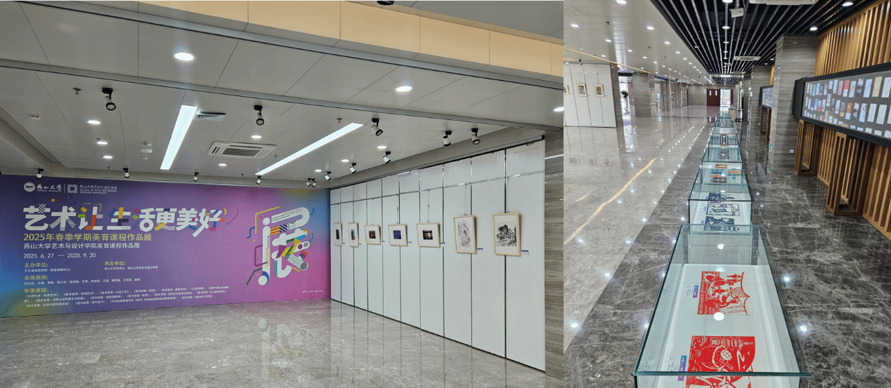 新图书馆一楼拉开帷幕。本次展览汇集了本学期多门美育公选课的优秀成果,包括《非遗传承—剪纸艺术》、《美术鉴赏—民间艺术》、《美术鉴赏—扎染工艺》、《美术鉴赏—织绣》、《摄影艺术》、《人造光线》、《经典中国山水画临摹》、《美术鉴赏—梵高与后印象主义绘画》、《美术实践—轻松画插画》、《美术实践—漆艺》、《美术实践—篆刻艺术鉴赏与体验》、《美术鉴赏—文人篆刻赏评》、《美术鉴赏—走进中国民居建筑》、《美术鉴赏—现代设计》、《中华优秀传统文化(篆刻)传承基地篆刻社团美育课程》、《美术实践—漫画创作与实践》等课程的学生作品。展览涵盖书法、绘画、篆刻、创意设计等多个艺术门类,是学校美育育人成效的一次生动呈现。