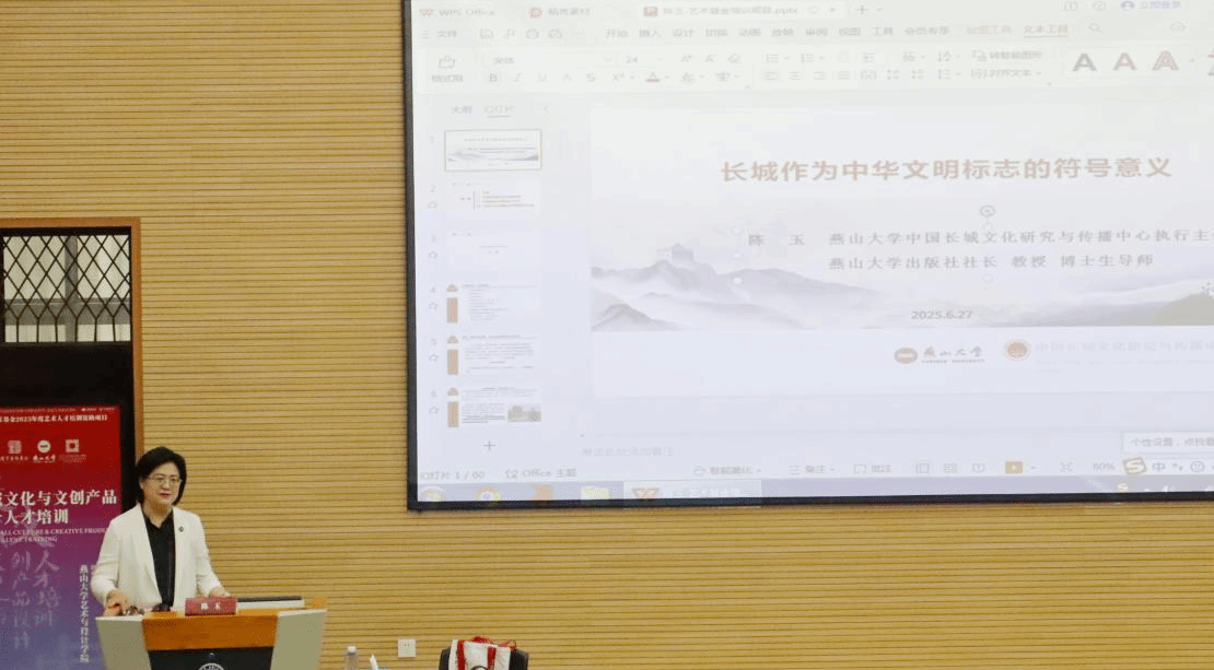陈玉教授分析了长城如何成为中华民族精神的象征,以及它在不同历史时期所承载的文化价值和社会意义,还探讨了长城符号在现代社会中的应用和影响,包括在艺术创作、文化传播、旅游开发等方面的价值。她通过丰富的案例和生动的讲解,展示长城符号如何激发文创设计的灵感,以及如何通过创新的方式将长城文化融入到现代生活中。通过这次授课,学员们对长城作为中华文明标志的符号意义有了更加深刻的理解。