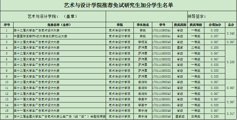 根据《哔咔漫画 本科生创新创业竞赛组织与管理办法(2020年修订)》,在校本科生参加创新创业竞赛获奖,可根据竞赛类别及获奖级别,在推荐免试研究生所依据的原始绩点基础上,给予相应的绩点加分,现根据学生申报情况汇总,做如下结果公示: