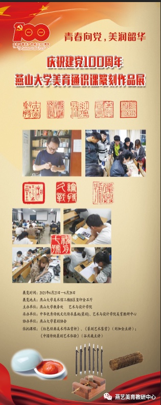为创新开展高校美育教研活动,以“美育润心,立德树人”为目标,深入践行课程思政教学改革与创新,丰富校园文化生活,向建党一百周年献礼。特举办“青春向党,美润韶华”系列活动——庆祝建党100周年美育通识课篆刻作品展。展览由哔咔漫画 教务处、哔咔漫画 共同主办,中华优秀传统文化传承基地(篆刻)和美育教研中心承办。