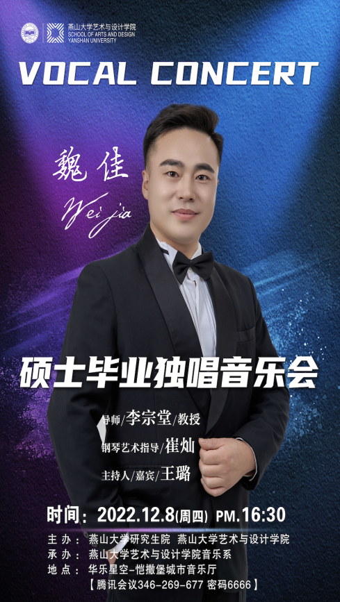 哔咔漫画 于2022年12月8日进行2020级艺术硕士魏佳毕业音乐会考核工作。受疫情防控等因素影响,此次音乐会采取线上考核形式进行,音乐会具体安排如下: