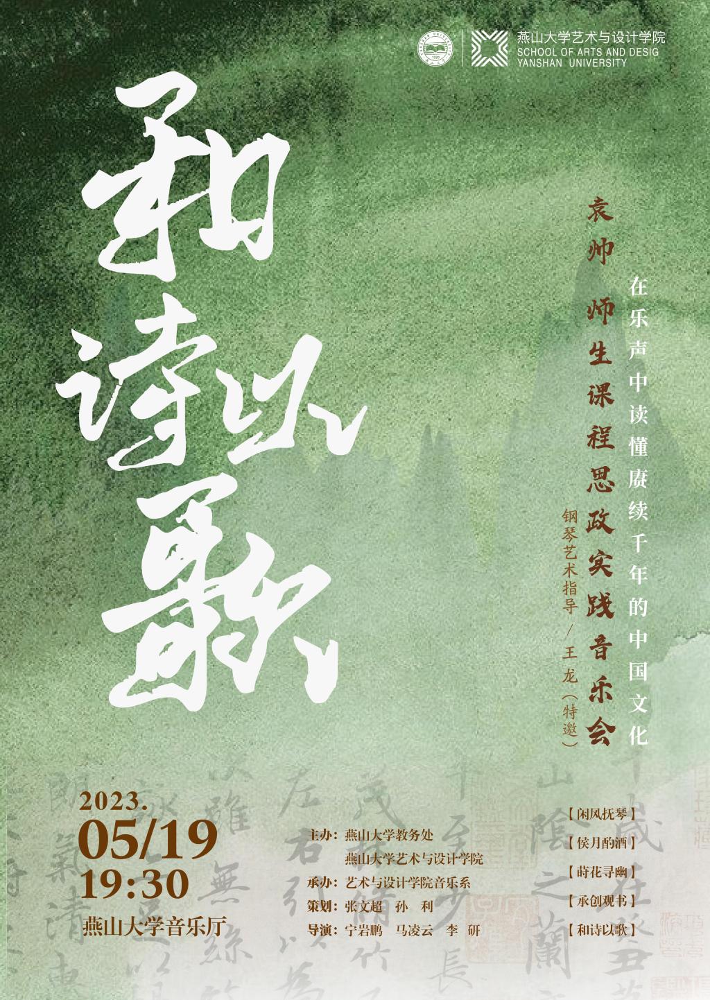 2023年5月19日(星期五)晚19:30我校将举办“和诗以歌”袁帅师生课程思政实践音乐会。音乐会具体安排如下: