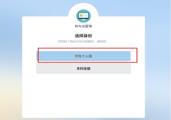 点击进入选择身份页面,单体选择学生个人组;然后进入页面进行具体的功能操作;