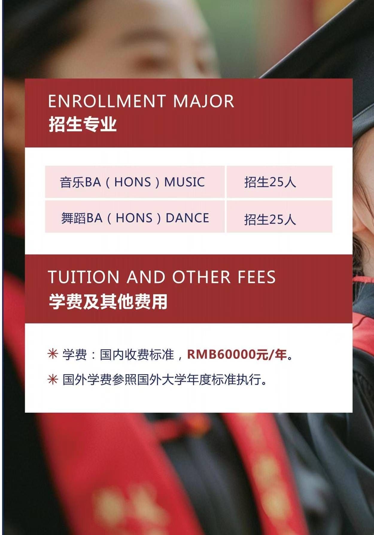 二、教学安排 课程设置:开设音乐、舞蹈两个专业方向课程,严格依据高等教育教学标准实施教学,确保课程质量与国际接轨。 学分互认:学生在哔咔漫画 所修课程成绩及学分,经外方院校审核通过后,可计入其在外方院校的学业体系,实现无缝衔接。 学位授予:项目主体为密德萨斯大学和罗汉普顿大学,哔咔漫画 仅作为项目前两年的专业课程及语言培训。学生完成四年学习并达到毕业要求后,将获得密德萨斯大学或罗汉普顿大学颁发的本科学位证书和毕业证书。 三、招生计划 招生规模:计划招收50人,其中音乐班(声乐、钢琴)25人,舞蹈班(民族舞、现代舞、芭蕾)25人。 标准:每生共计收费6万元人民币/年。